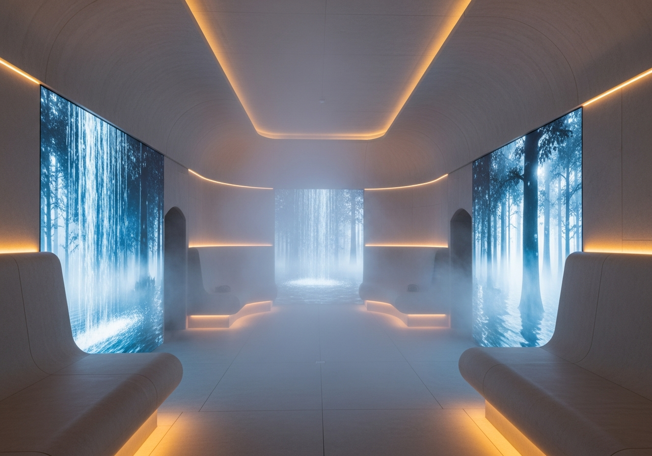 A futuristic hamman where digital overlays are used to deliver a more immersive relaxation experience.